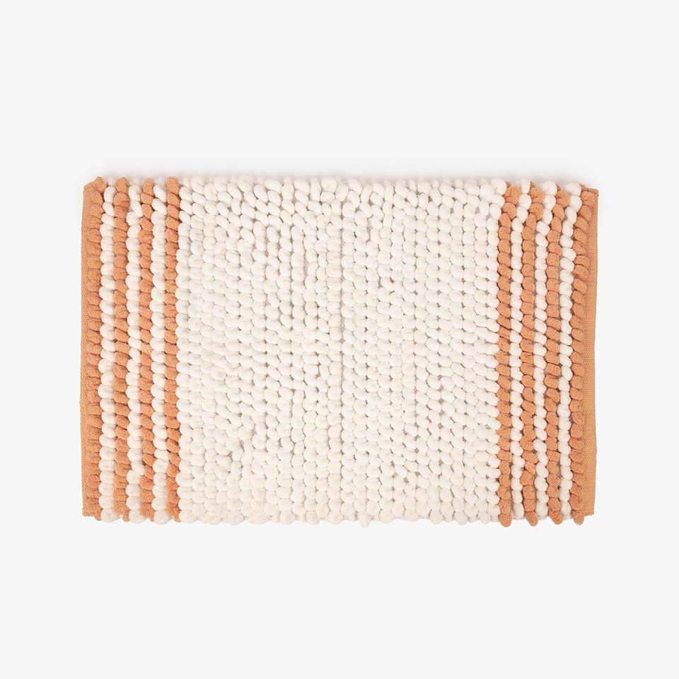 4. Saboneteira Cerâmica PVP 7,99€ | 5. Tapete de Casa de Banho Chenilla Branco e Laranja ou Amarelo PVP 19,00€ | 6. Tapete de Casa de Banho Algodão Azul ou Branco Entrelaçado PVP 17,00€